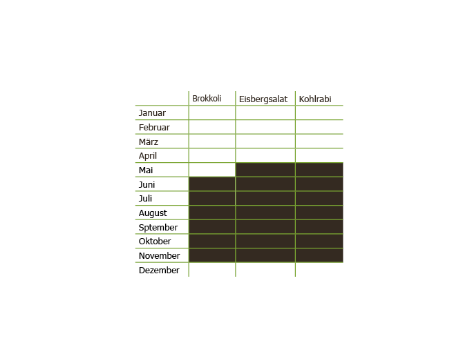 Auf der folgenden Infografik sehen Sie unsere Erntezeiten der Gemüsesorten aus unserem Anbau.